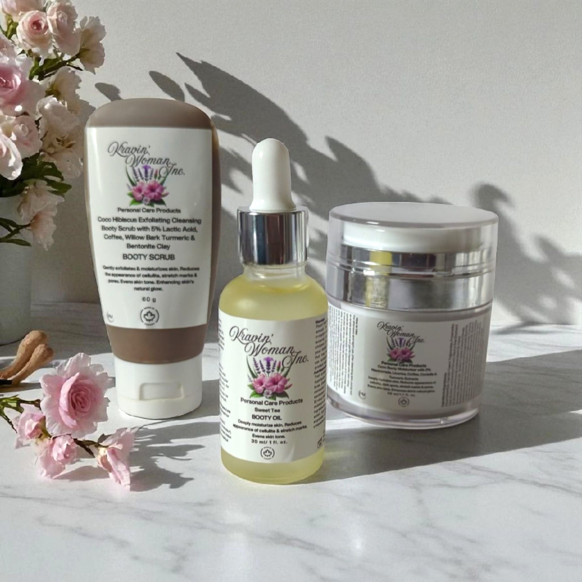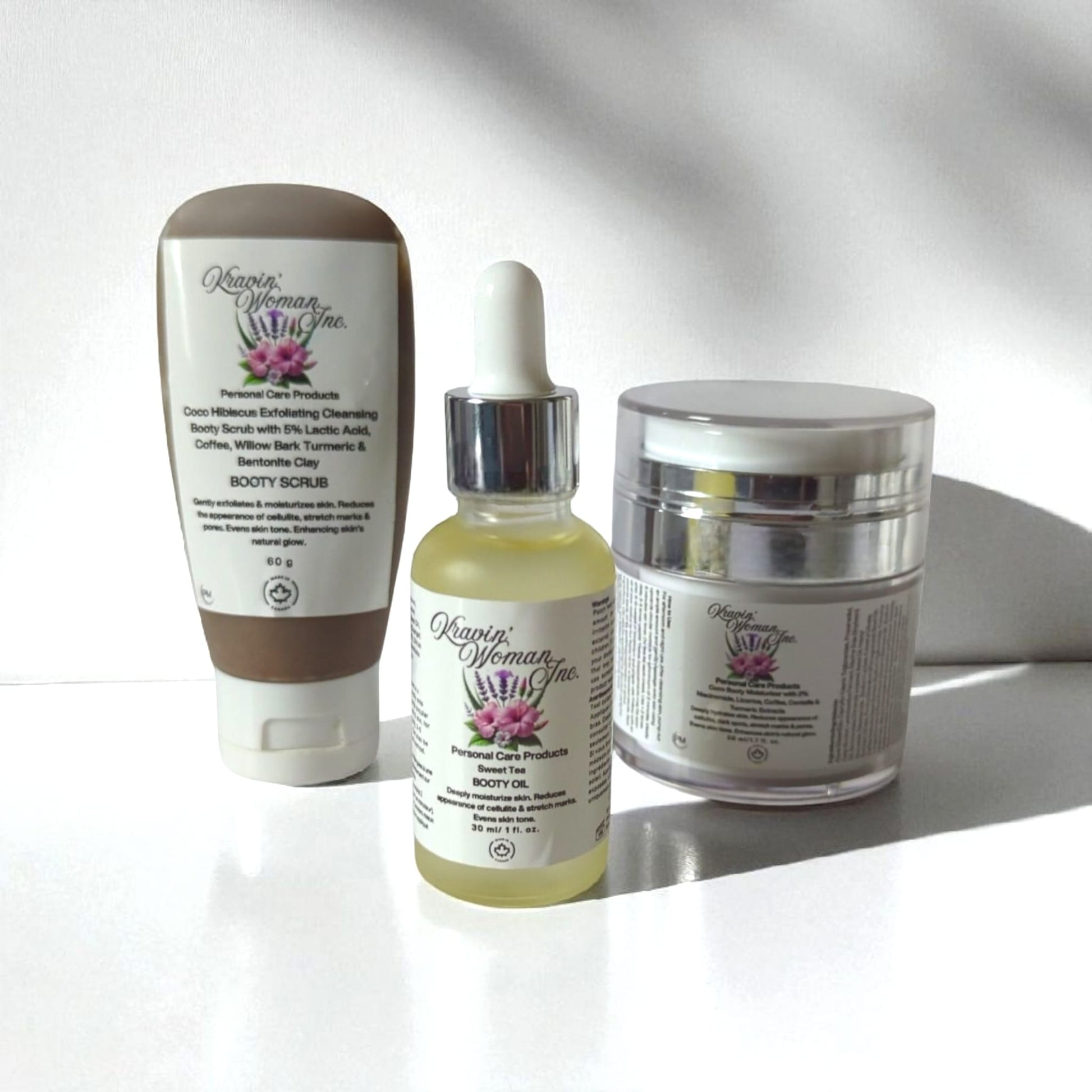 This kit includes our 60 g Booty Scrub, our 50 ml Booty Moisturizer and our 30 ml Booty Oil valued at $143.00.
